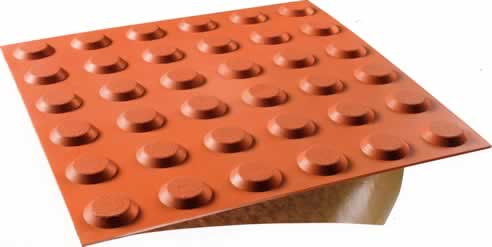 This design has flat topped domes set in evenly spaced rows parallel to the direction of travel along the platform. The offset of the domes indicates the direction of travel to the train. Used adjacent to safe carriageway crossings, the surface can be any colour other than red, but should provide a good contrast with the surrounding area to assist partially sighted people.